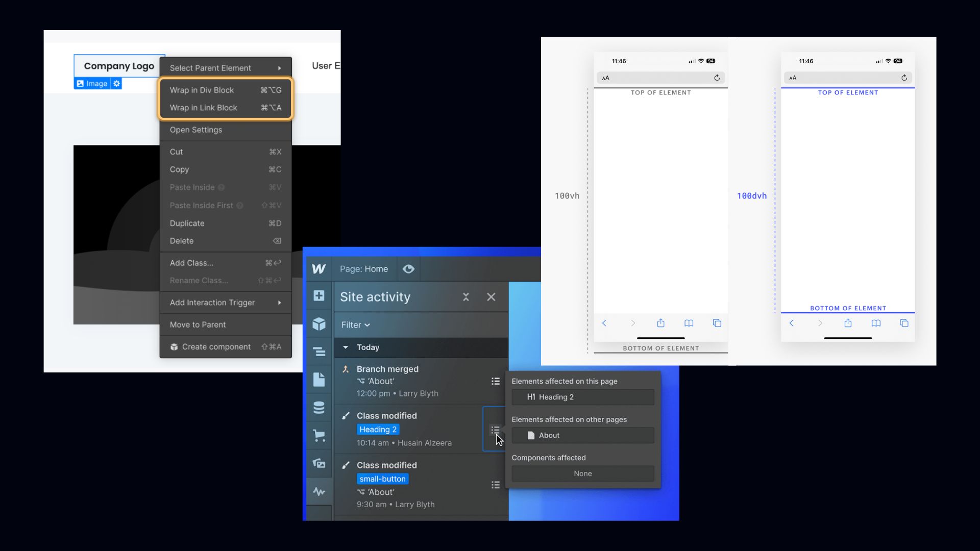 - Nouveaux raccourcis clavier et options de menu contextuel pour envelopper un élément dans une div ou un bloc de lien, ce qui simplifie une pratique courante chez les concepteurs (workflow).