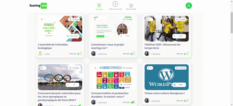 Vous souvenez-vous de la sensation d'être premier de votre classe, de la fierté que vous ressentez lorsque vous recevez une bonne note à un test ? Eh bien, maintenant, tu es plus âgé, tu as obtenu ton diplôme, mais tes compétences n'ont jamais cessé de grandir ! Scoring.me est une plateforme qui vous permet de vraiment vous faire une idée de votre niveau dans n'importe quelle compétence particulière qui peut être testée en ligne. Vous pouvez ensuite partager le score que vous obtenez, afin de mettre en valeur vos compétences à des fins professionnelles.